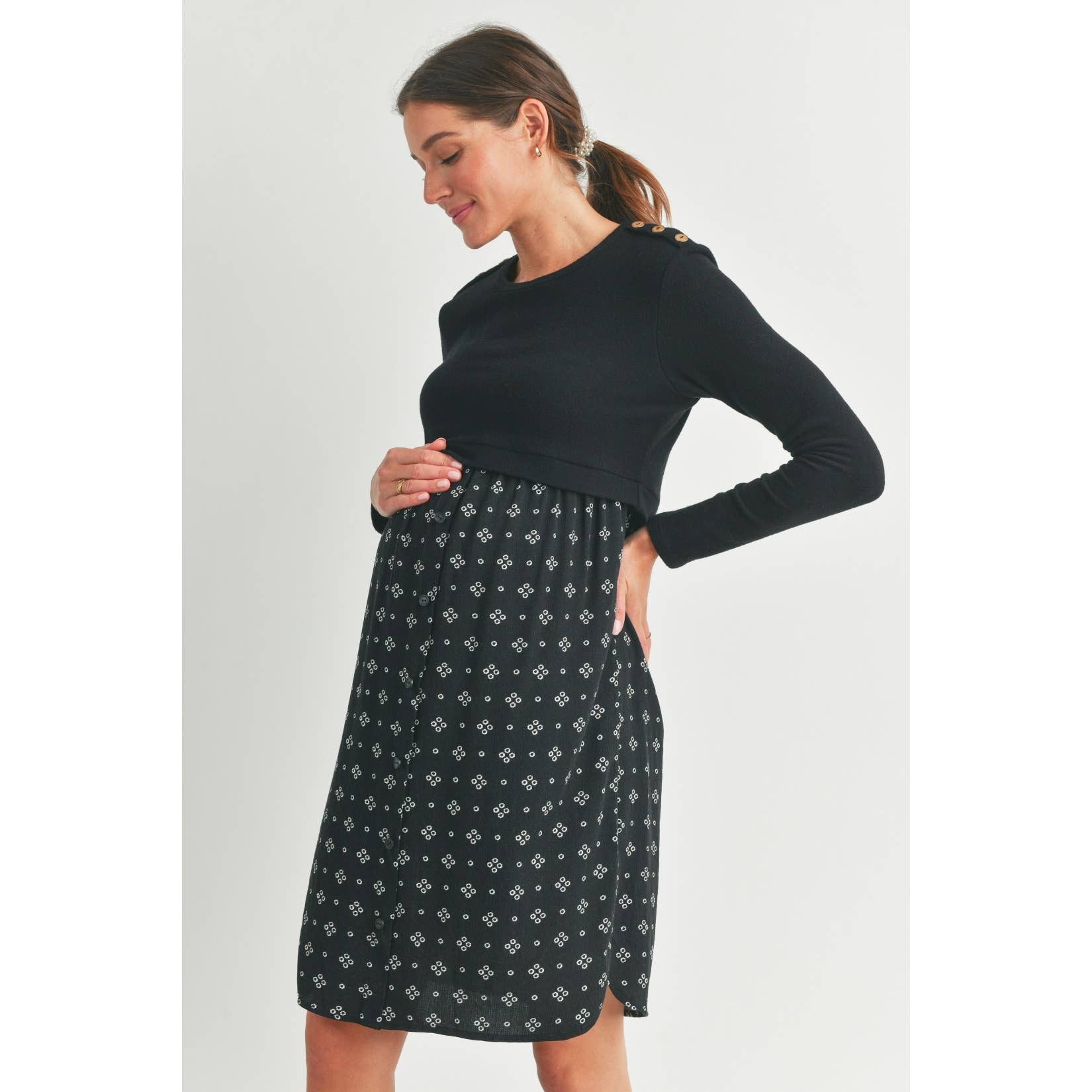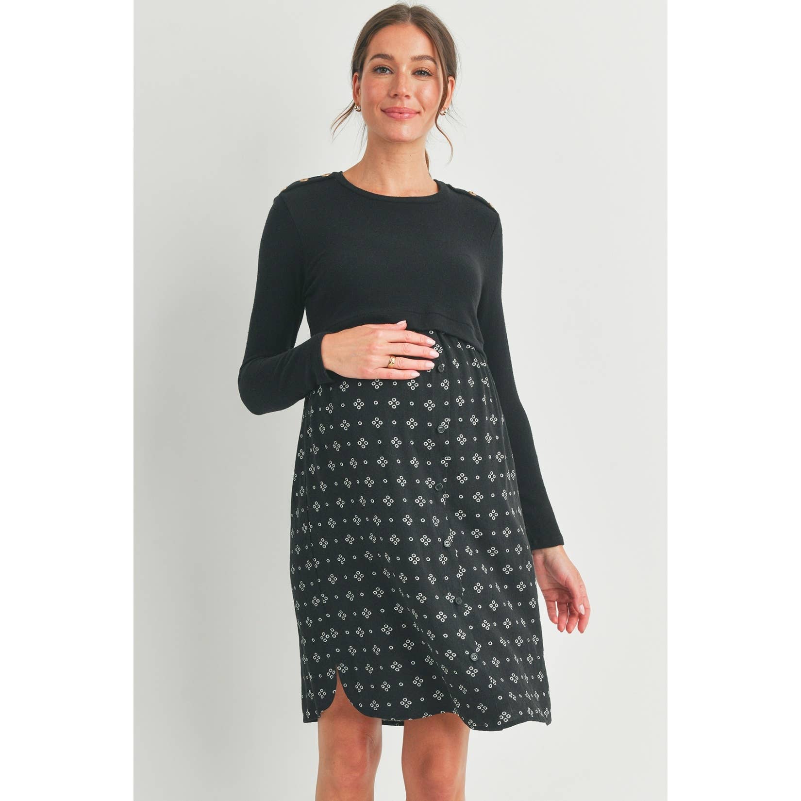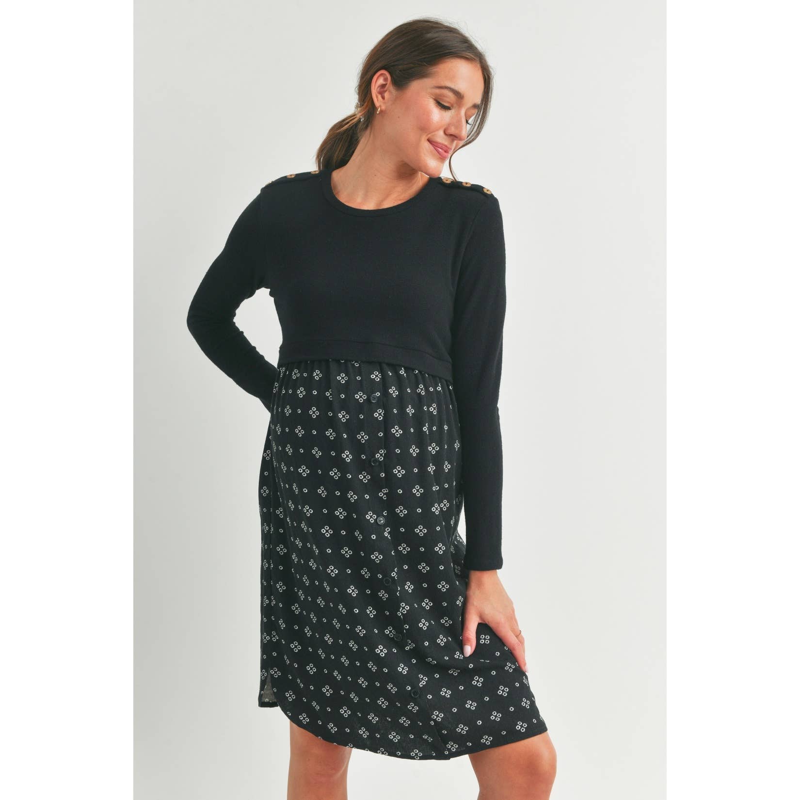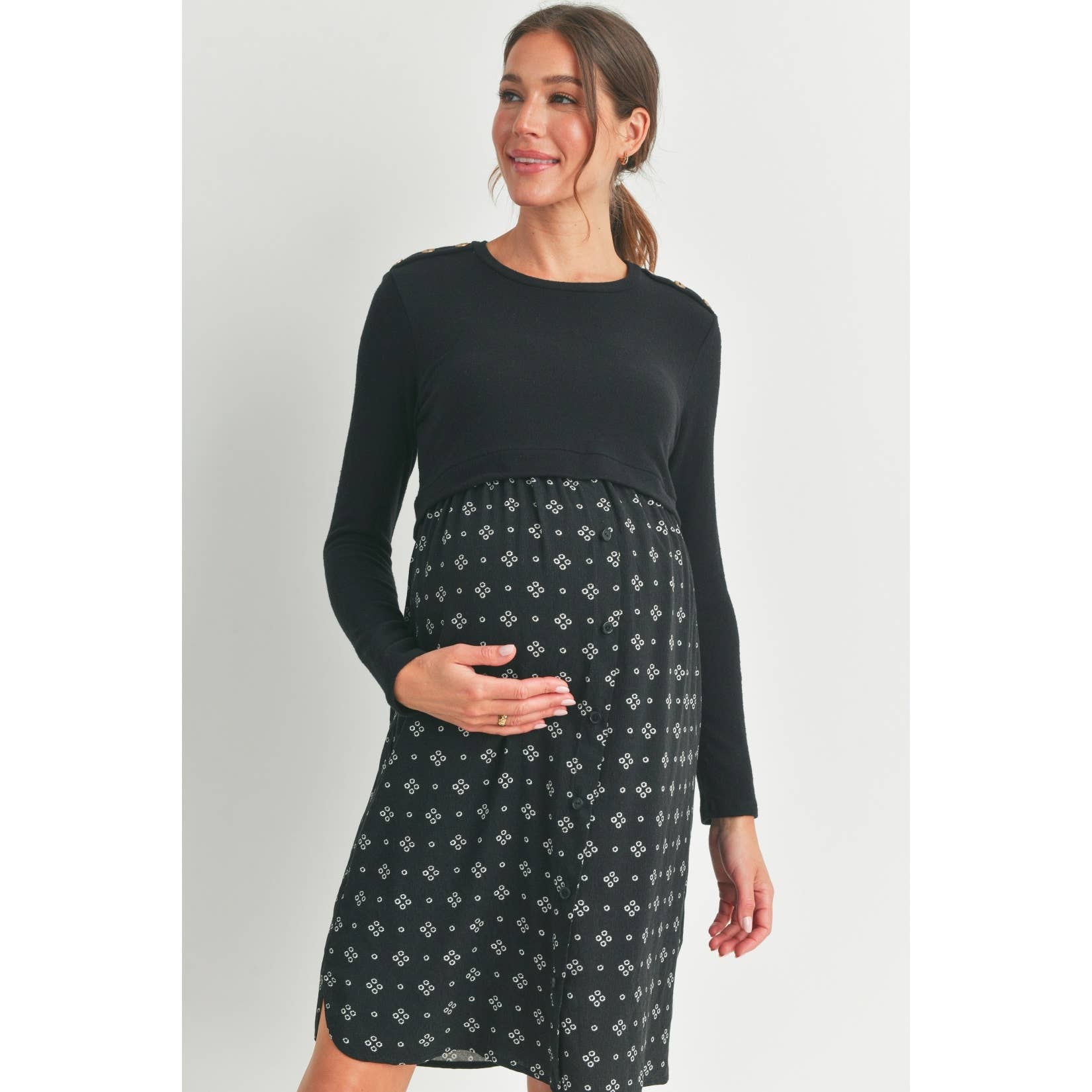 Embrace comfort and style with this Black Double Layer Long Sleeve Maternity Nursing Dress. Designed with playful button shoulder details, it offers easy nursing access while keeping you cozy during cooler days. The soft double layers gently hug your bump, making it a perfect choice for both pregnancy and postpartum moments. Slip into this dress for effortless chic and functional flair!