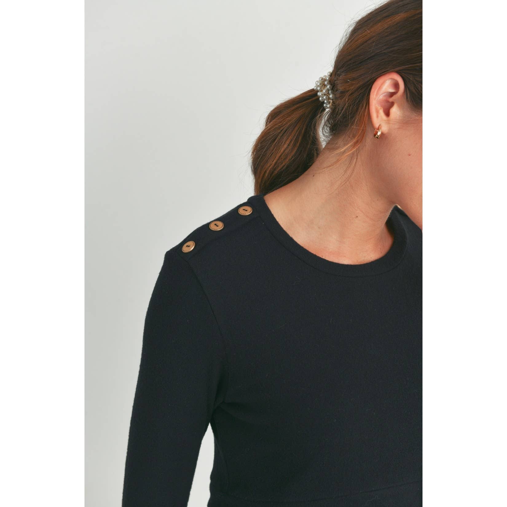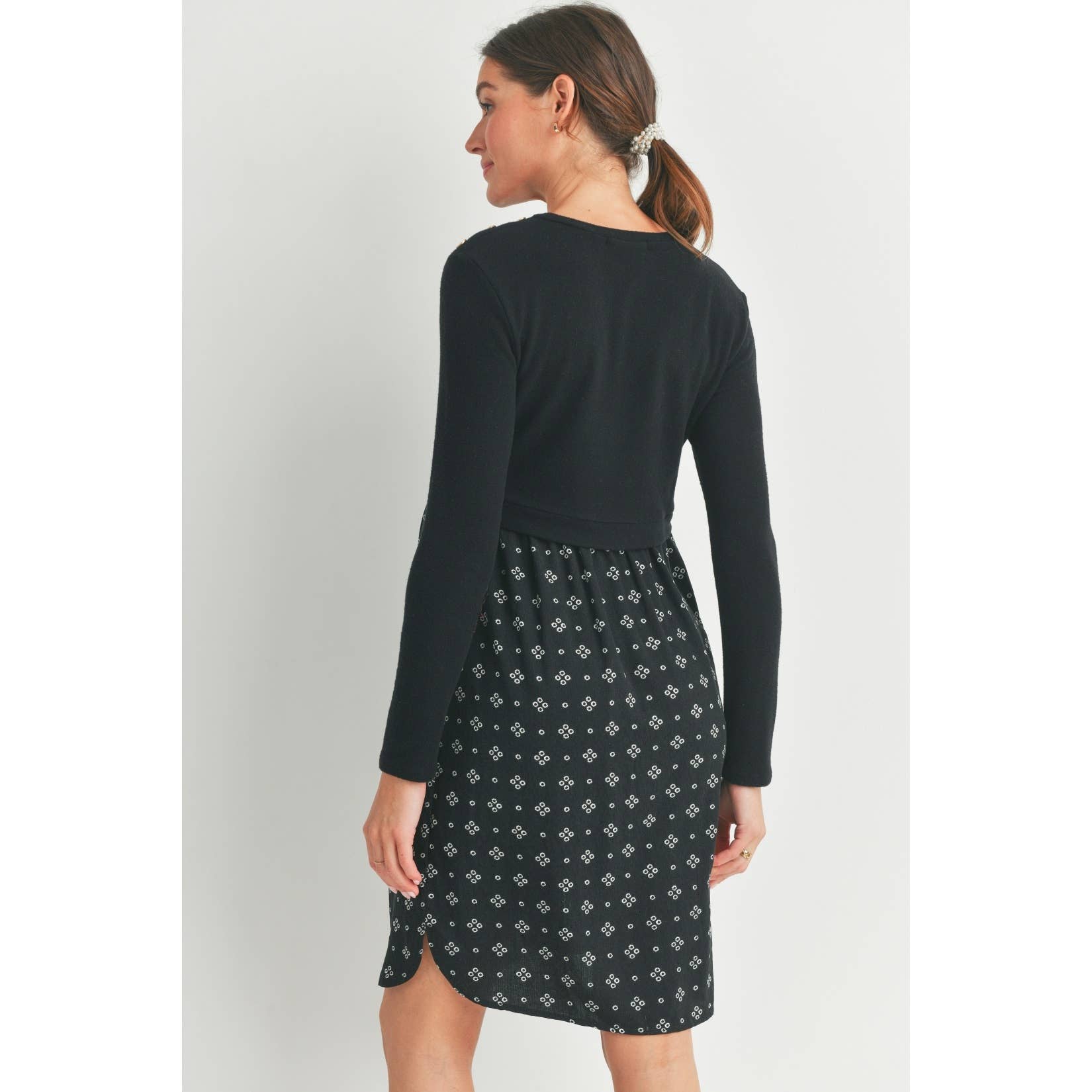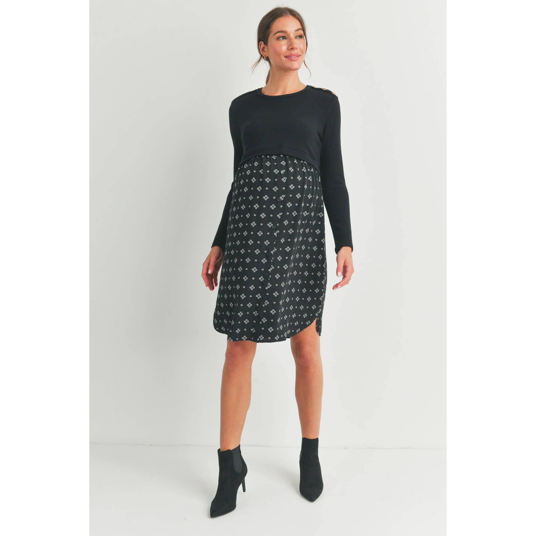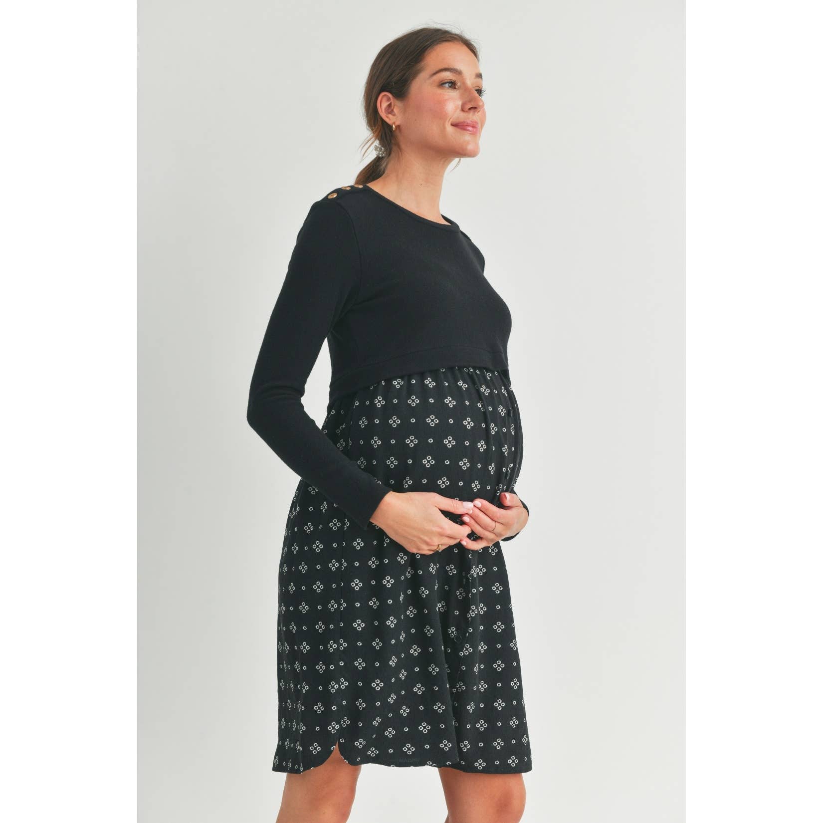 Embrace comfort and style with this Black Double Layer Long Sleeve Maternity Nursing Dress. Designed with playful button shoulder details, it offers easy nursing access while keeping you cozy during cooler days. The soft double layers gently hug your bump, making it a perfect choice for both pregnancy and postpartum moments. Slip into this dress for effortless chic and functional flair!
