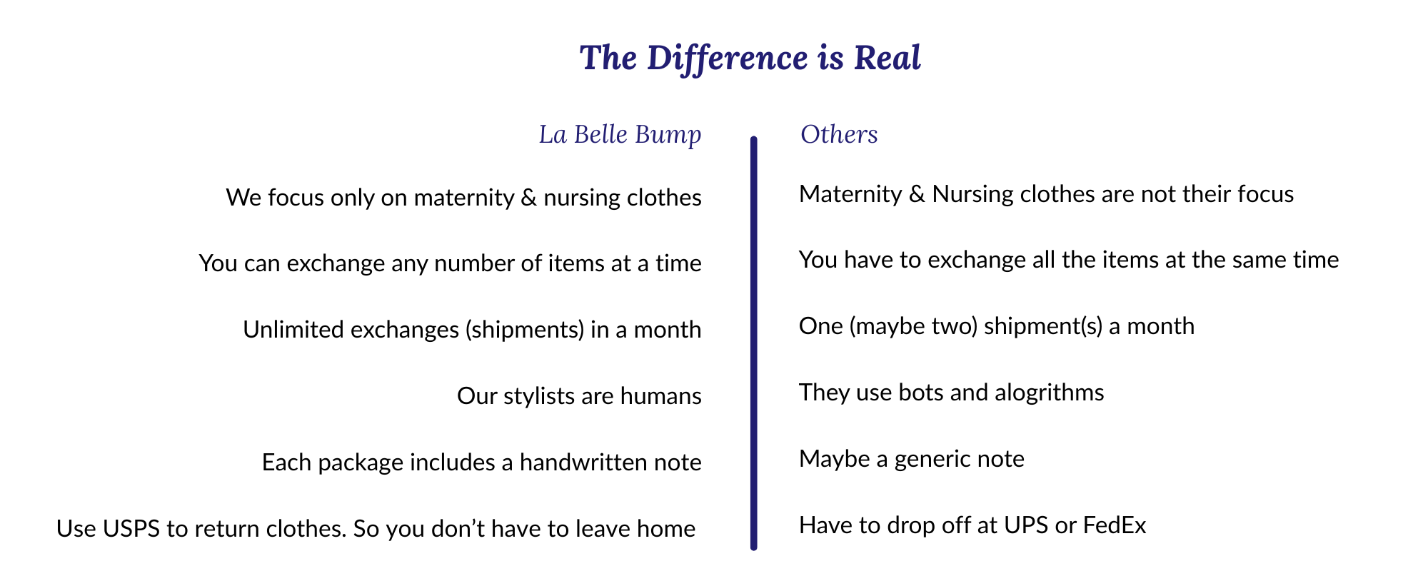 ★★★★★CatherineLa Belle Bump was one of the best decisions of my pregnancy. I enjoyed the new clothes each week, but I especially loved feeling stylish and pretty even when my body was hurting or I was feeling sick. For the price of one shopping trip to my local maternity store, I had an endless wardrobe! I also appreciated the hand written notes from the stylists. They actually took time to read my comments and tailor my package for my needs.