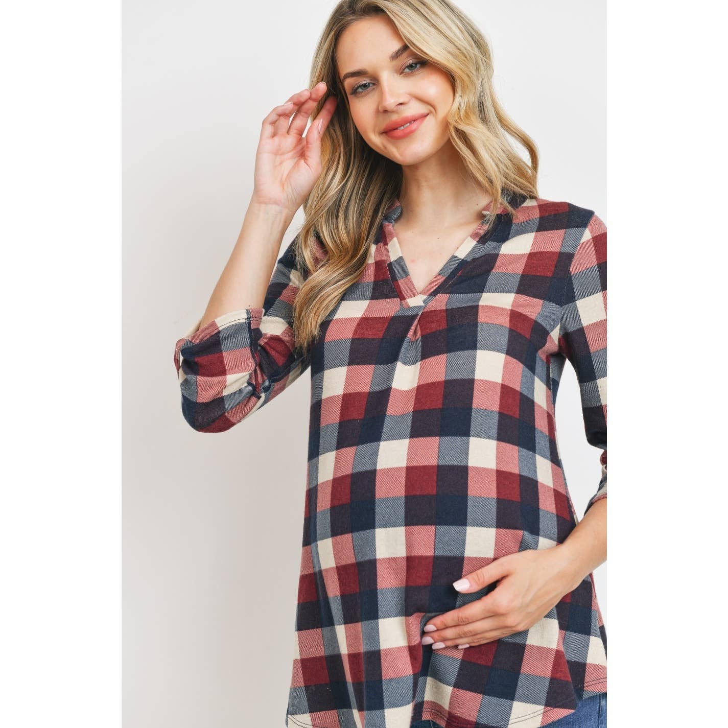 Introducing Portia—your new go-to maternity essential that's equal parts cozy and chic! This plaid and checker print hacci knit tunic features a flattering V-neck and easy 3/4 sleeves that work beautifully throughout your pregnancy and beyond. The soft, stretchy fabric moves with you while the playful print keeps things fun and stylish. Layer it, dress it up, or keep it casual—Portia adapts to your ever-changing bump with effortless grace and comfort.