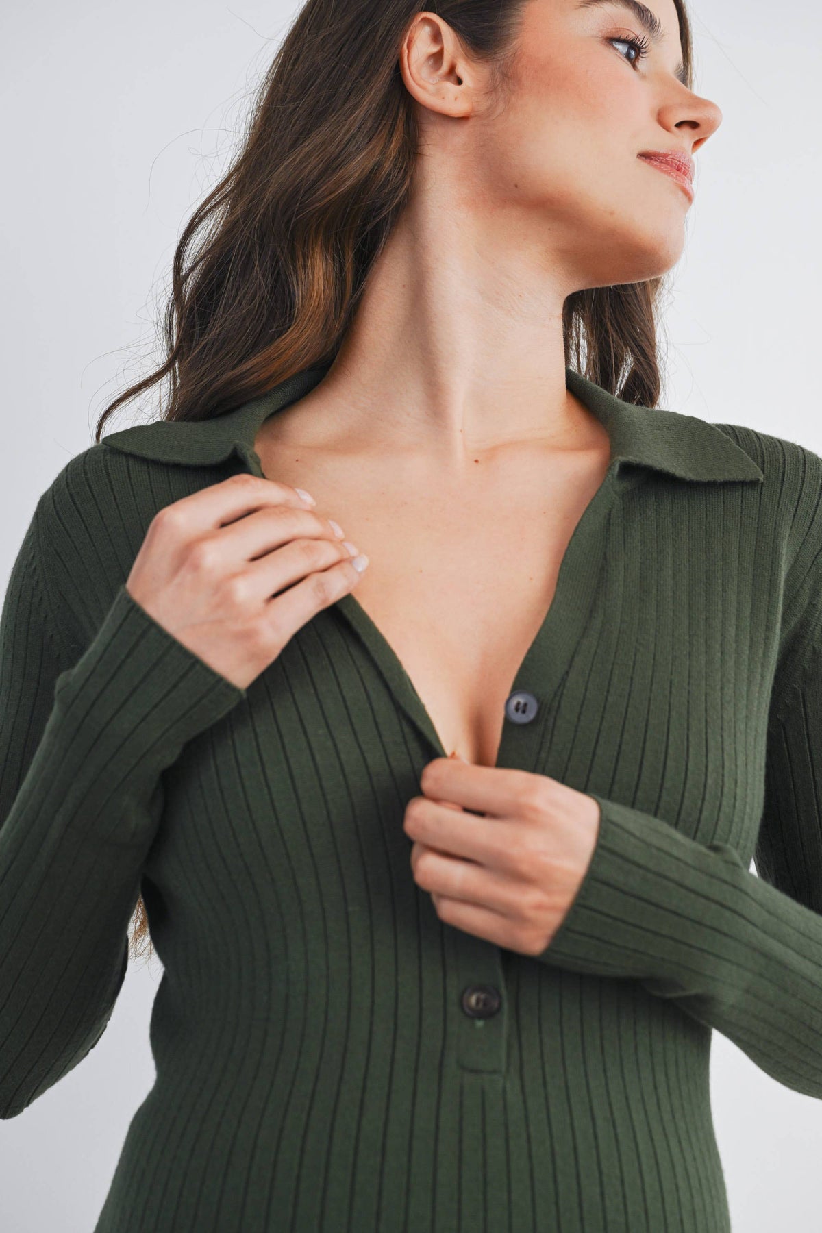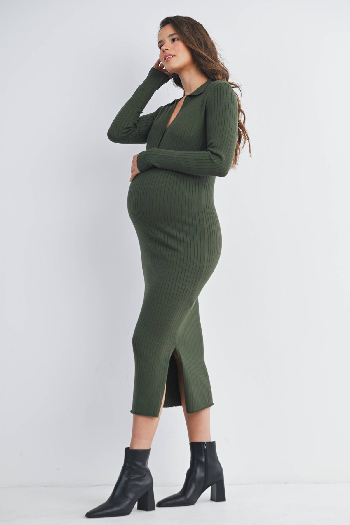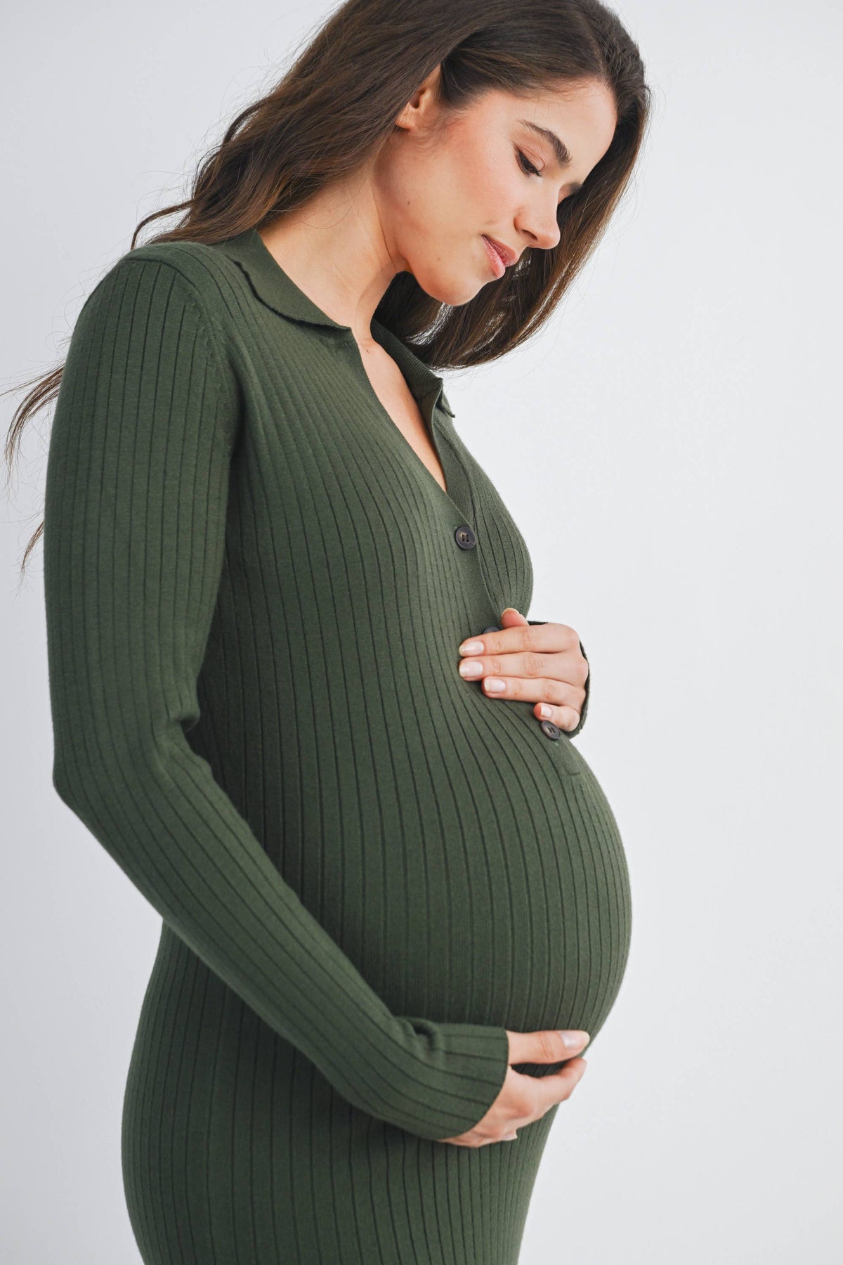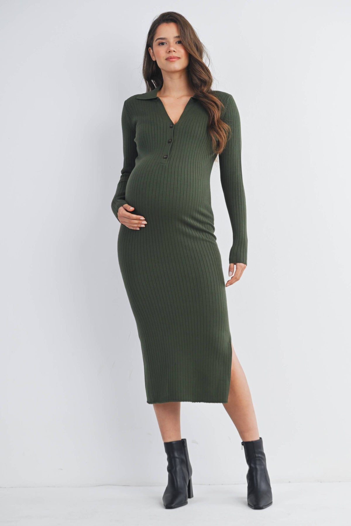 Embrace comfort and style in this olive ribbed knit midi dress designed just for moms-to-be. With a flattering collared neckline and button-down front, it offers easy wear and a chic look. The long sleeves and stretchy fabric keep you cozy while accommodating your growing bump. Perfect for dressing up or down, this playful piece ensures you feel fabulous at every stage.