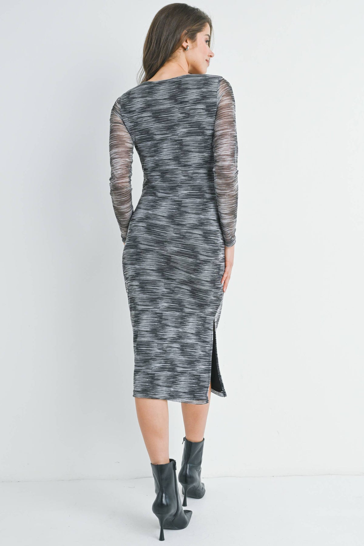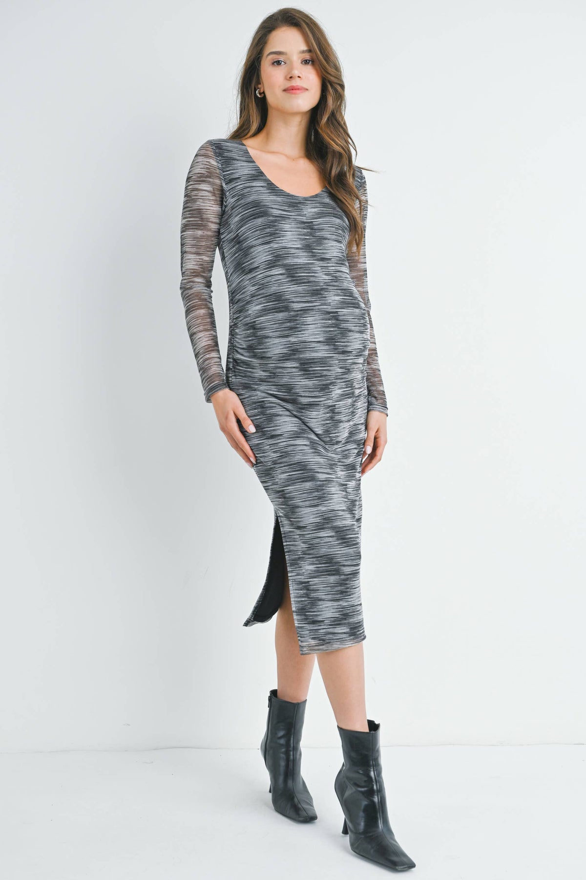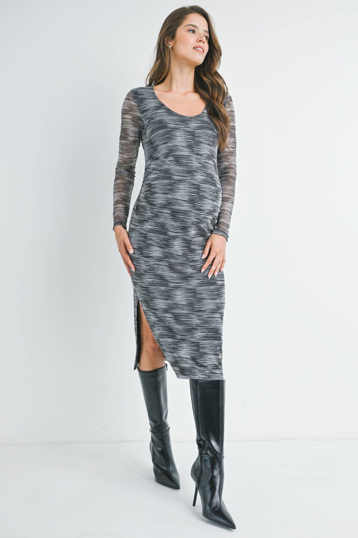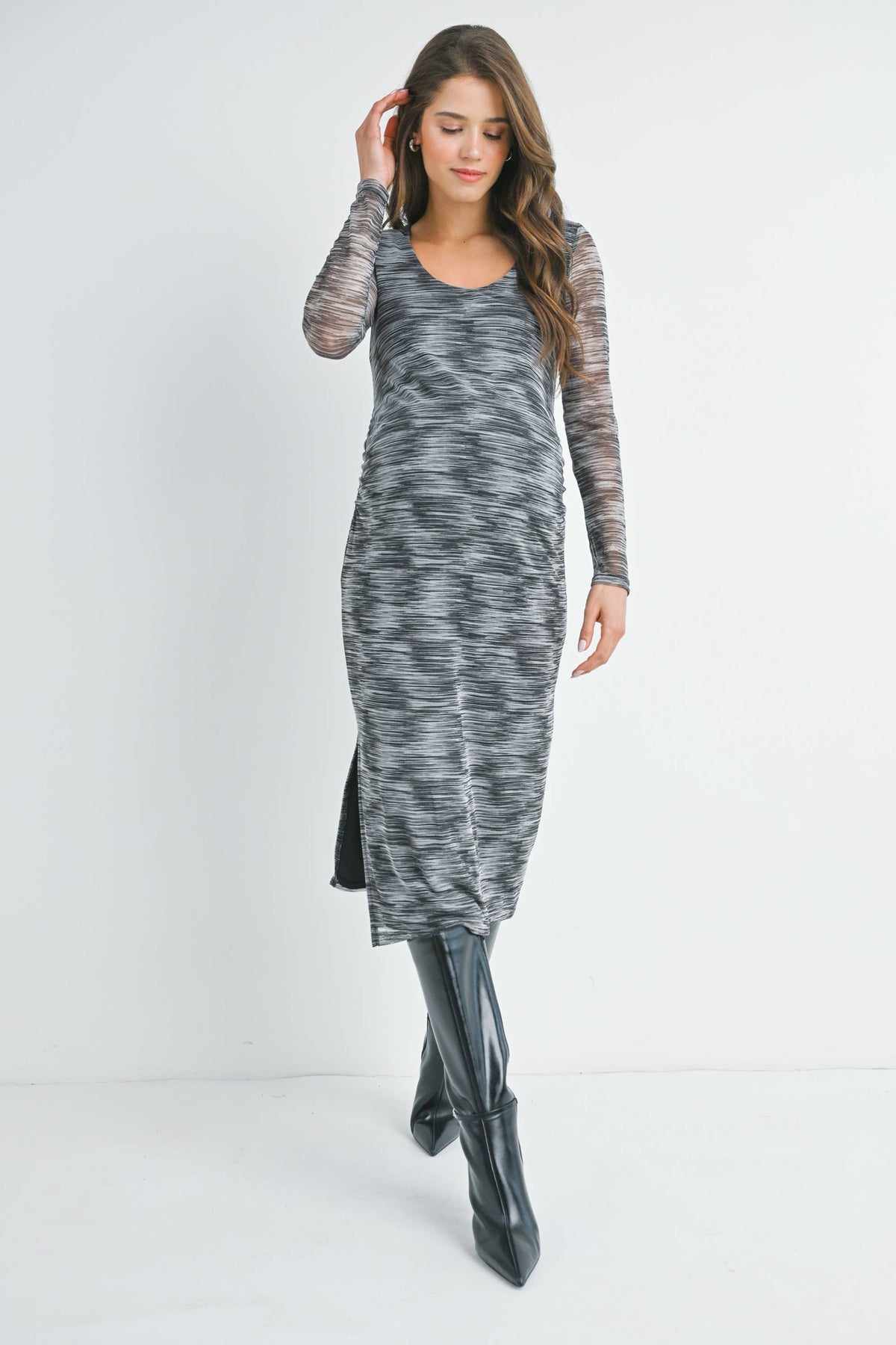 Step out in style and comfort with this Scoop Neck Long Sleeve Maternity Mesh Midi Dress. Crafted in a chic charcoal grey, its sheer mesh fabric gives a flirty peek while the ruched sides gently hug your bump, celebrating your beautiful shape. The side slit adds a playful twist, making every step feel effortlessly elegant. Perfect for any occasion where you want to feel fabulous and radiant throughout your pregnancy.