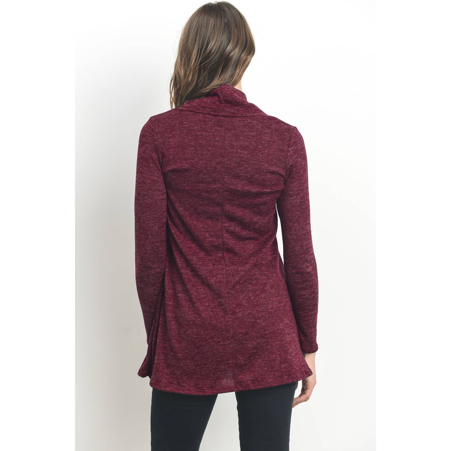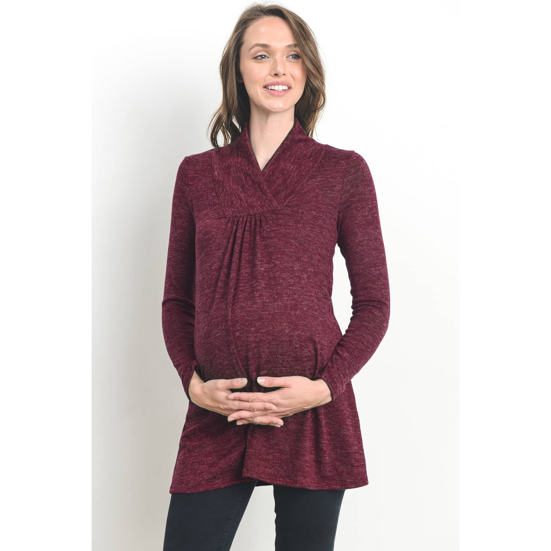 Wrap yourself in cozy comfort with this wine colored shawl collar maternity tunic sweater. Designed with stretchy knit fabric that grows with you, this long-sleeve essential features a flattering shawl neckline and generous length for bump-friendly coverage. The wine hue adds a touch of sophistication to your everyday maternity wardrobe.
