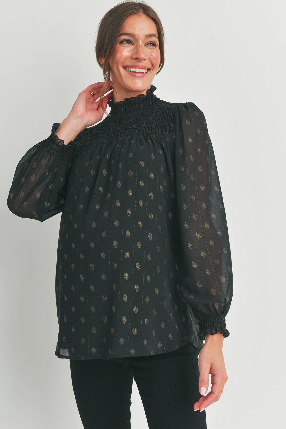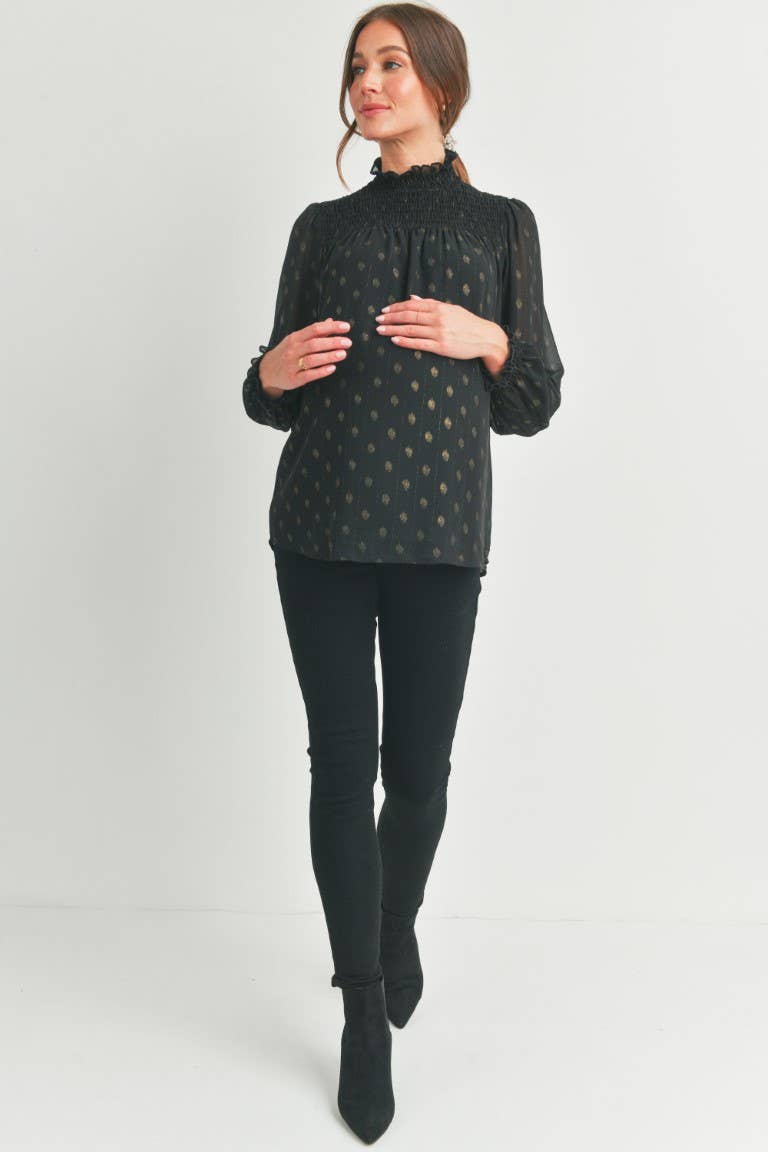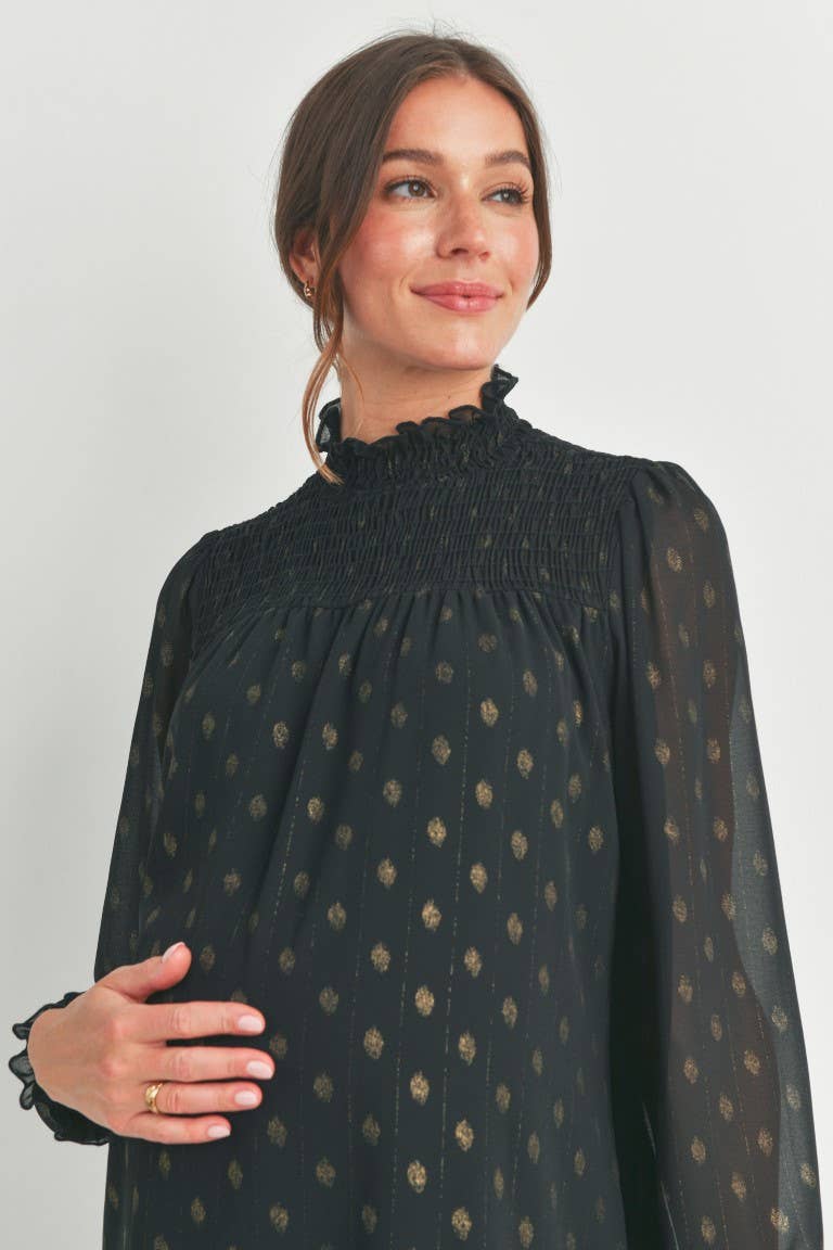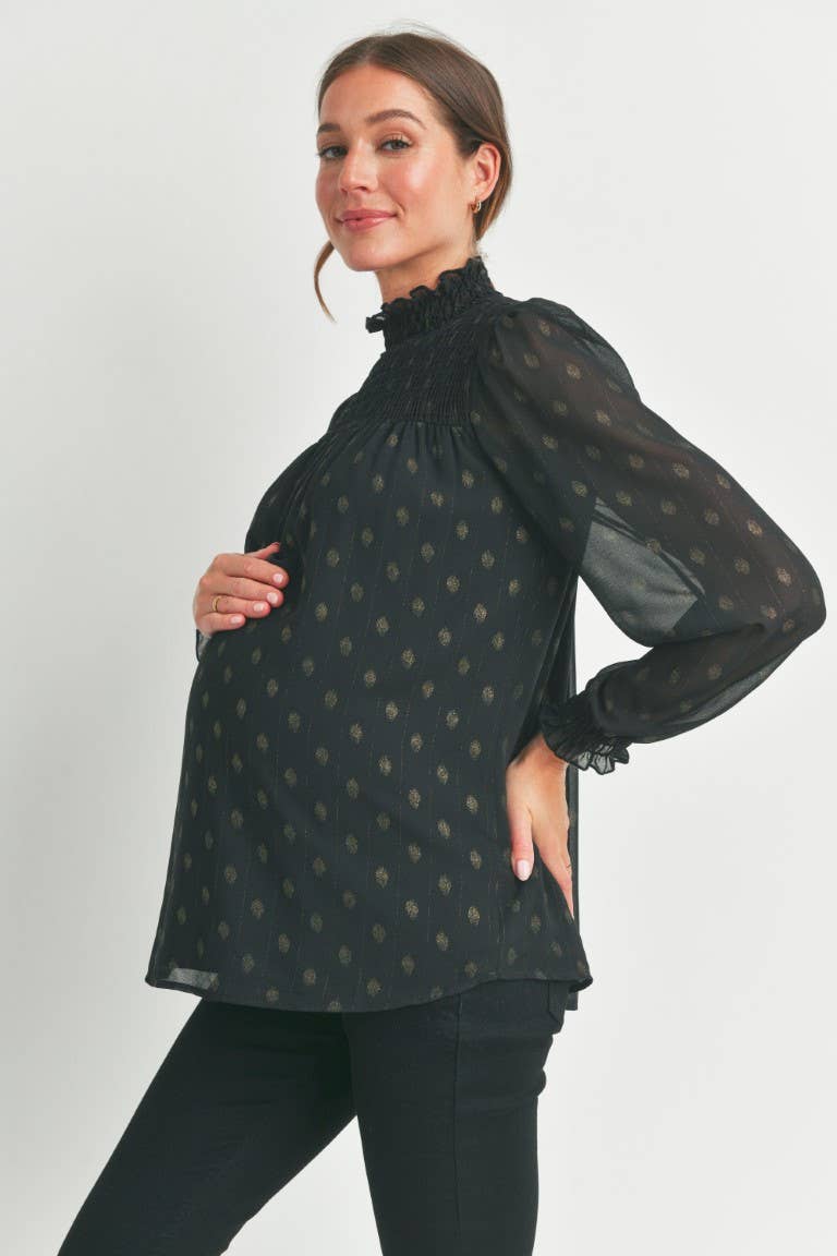 Elevate your maternity style with the Madison top, featuring a charming smocked mock neck and playful smocked cuffs. Its long sleeves offer cozy coverage while the delicate smocking adds a touch of whimsy, making it perfect for glowing moms who want comfort and style all in one.