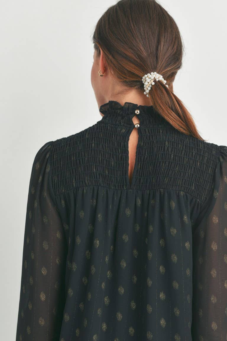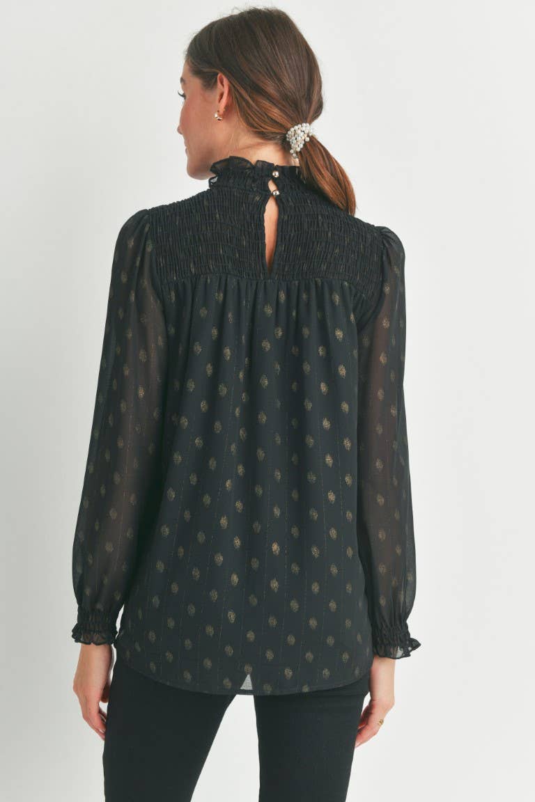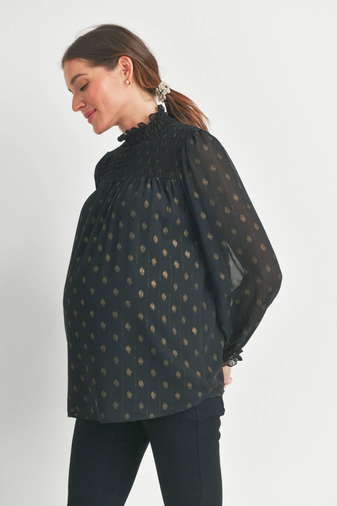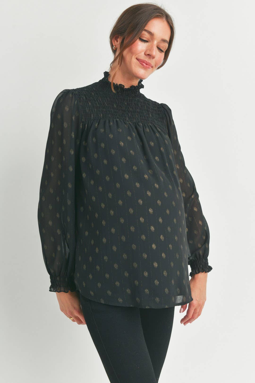 Elevate your maternity style with the Madison top, featuring a charming smocked mock neck and playful smocked cuffs. Its long sleeves offer cozy coverage while the delicate smocking adds a touch of whimsy, making it perfect for glowing moms who want comfort and style all in one.