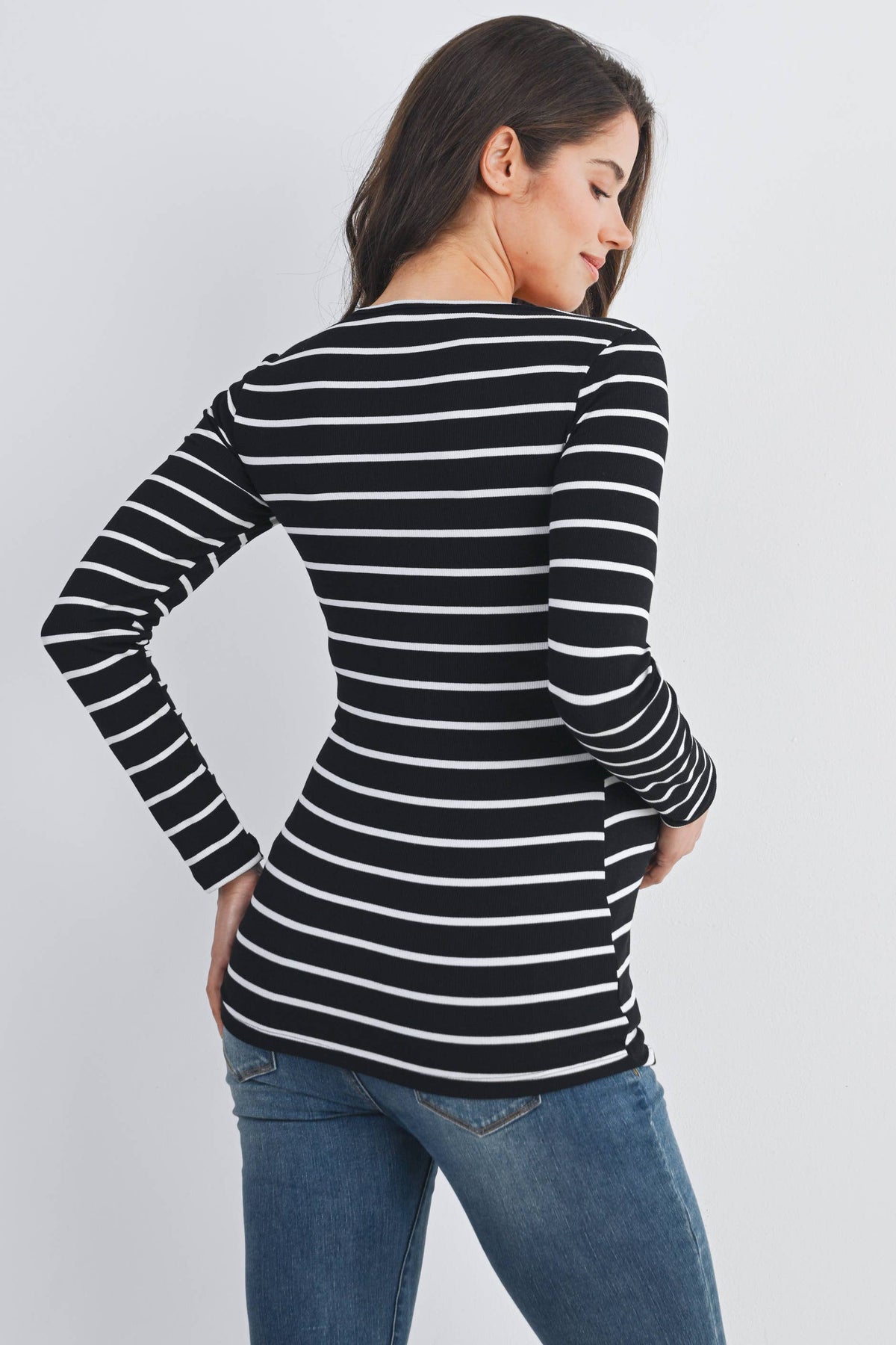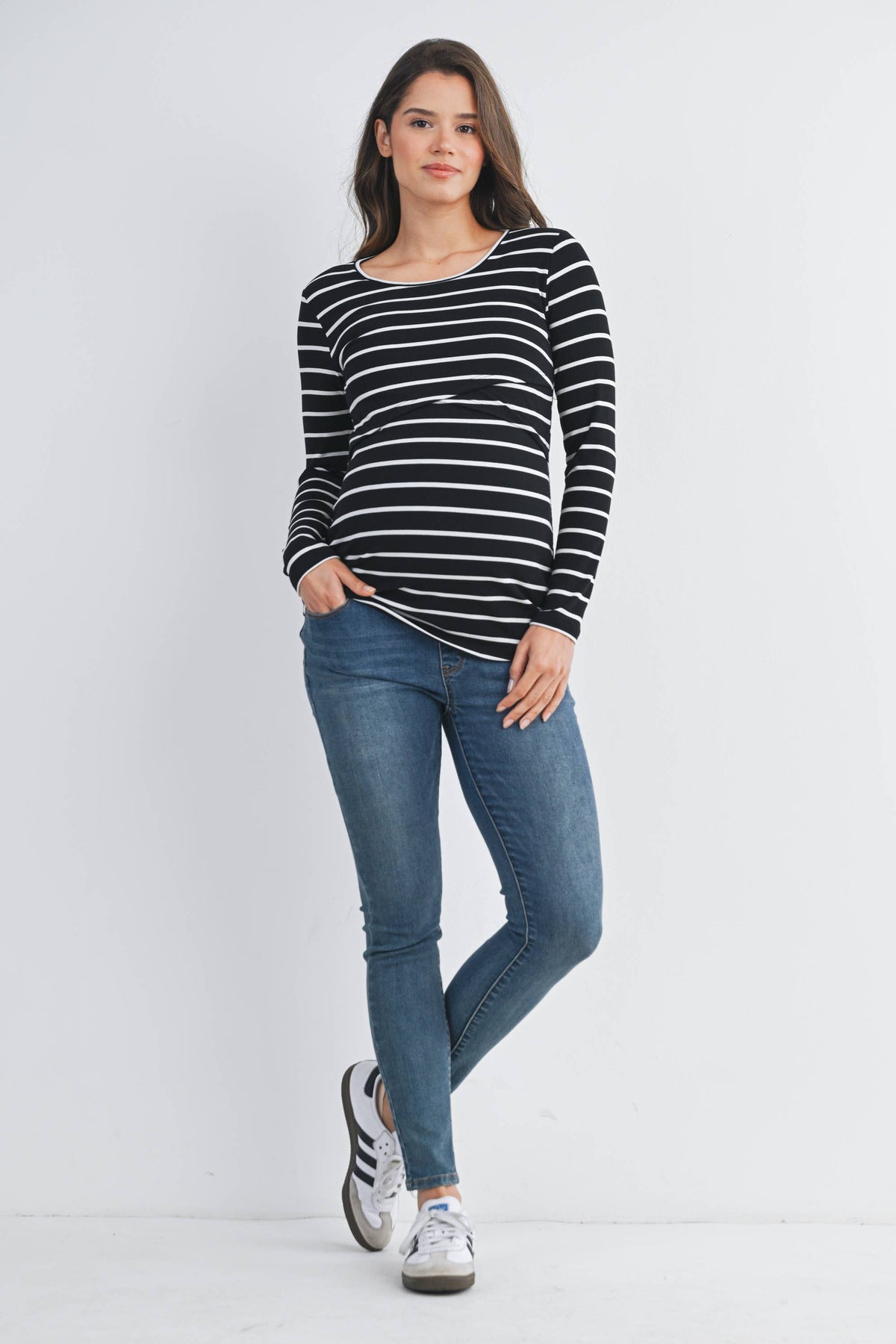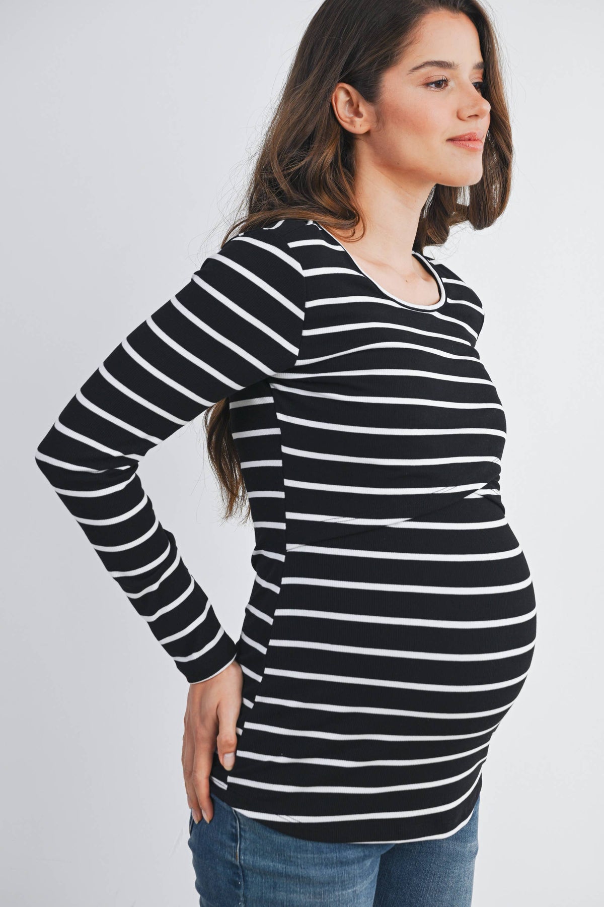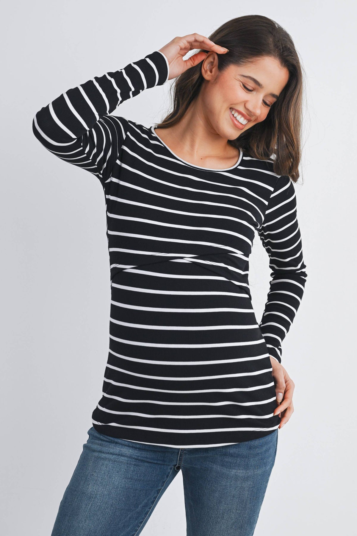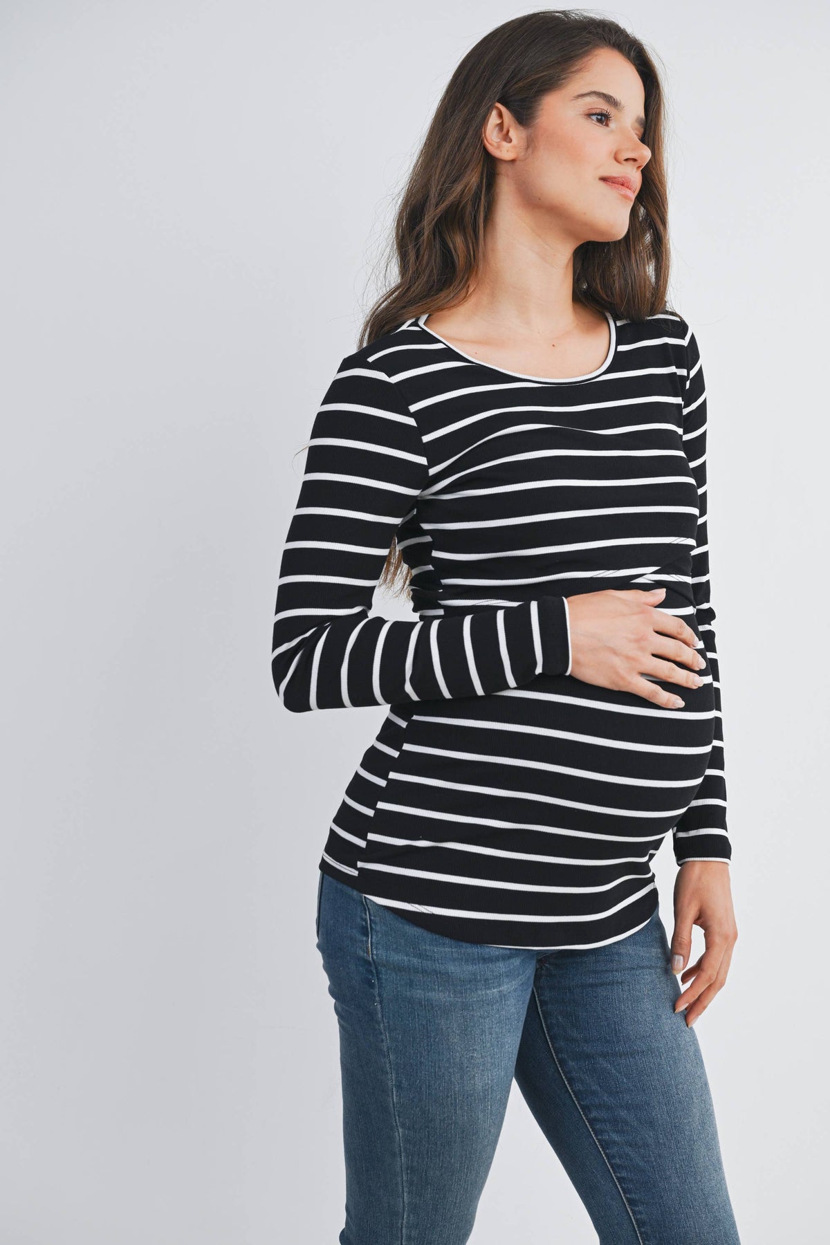 This playful striped long sleeve top is designed with a double-layer, ribbed knit fabric to keep you cozy while making nursing easy and discreet. The flattering black and white stripes add a fun twist to your maternity wardrobe, and the stretchy fit moves comfortably with your changing shape.