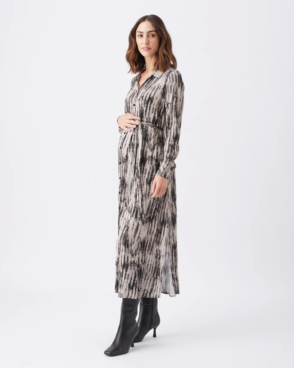 The Sylvia Shirt Dress brings effortless style with a playful twist. Its unique print and waist tie add charm, while the shaped hem and side splits keep things fun and flirty. Made from lightweight, 100% viscose, it’s comfy for all-day wear. The semi-fitted bodice and A-line skirt flatter every bump, and the button-up front makes nursing a breeze. With multiple sleeve options, it’s perfect for mixing up your look. Pair with boots and step out in chic, relaxed confidence!