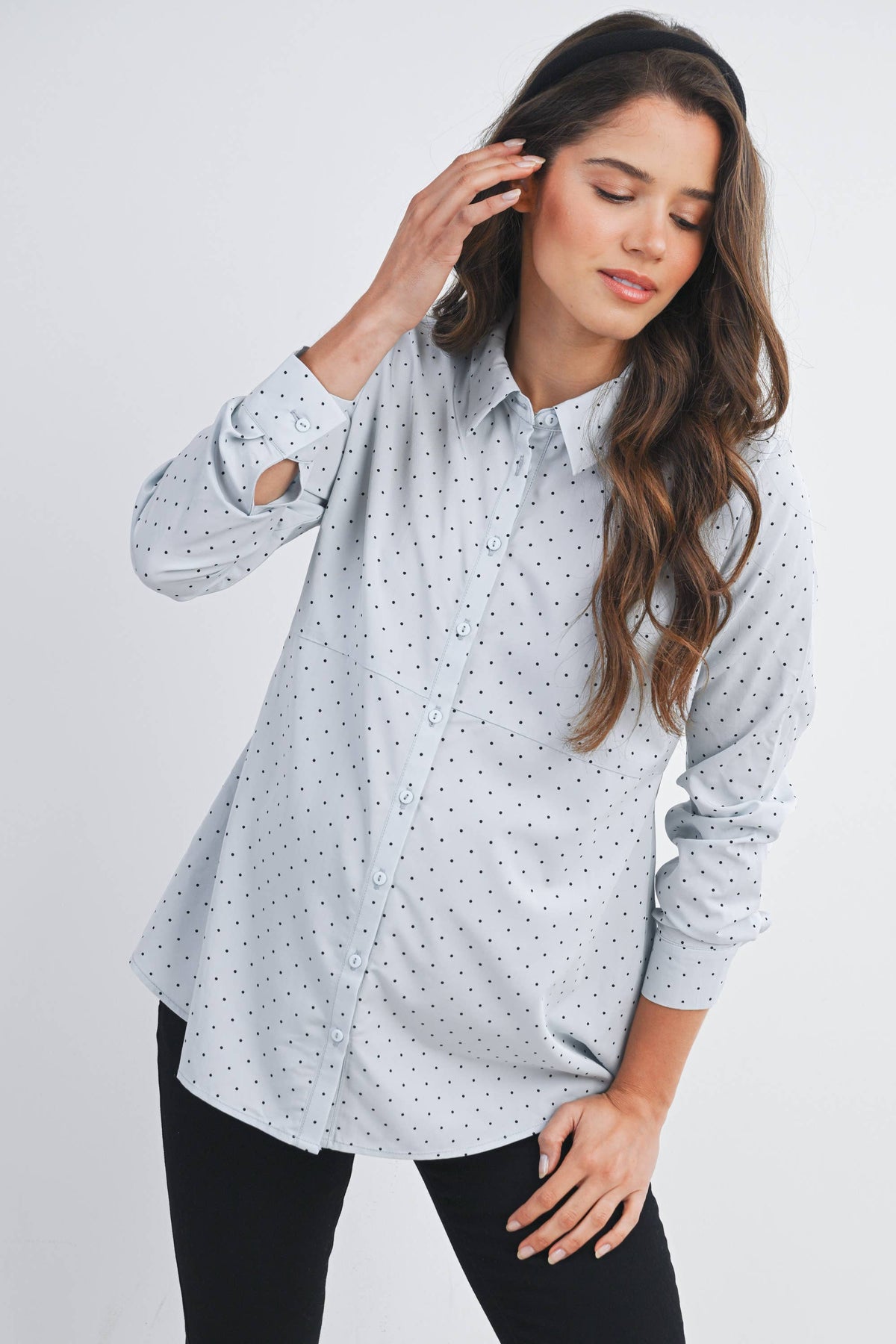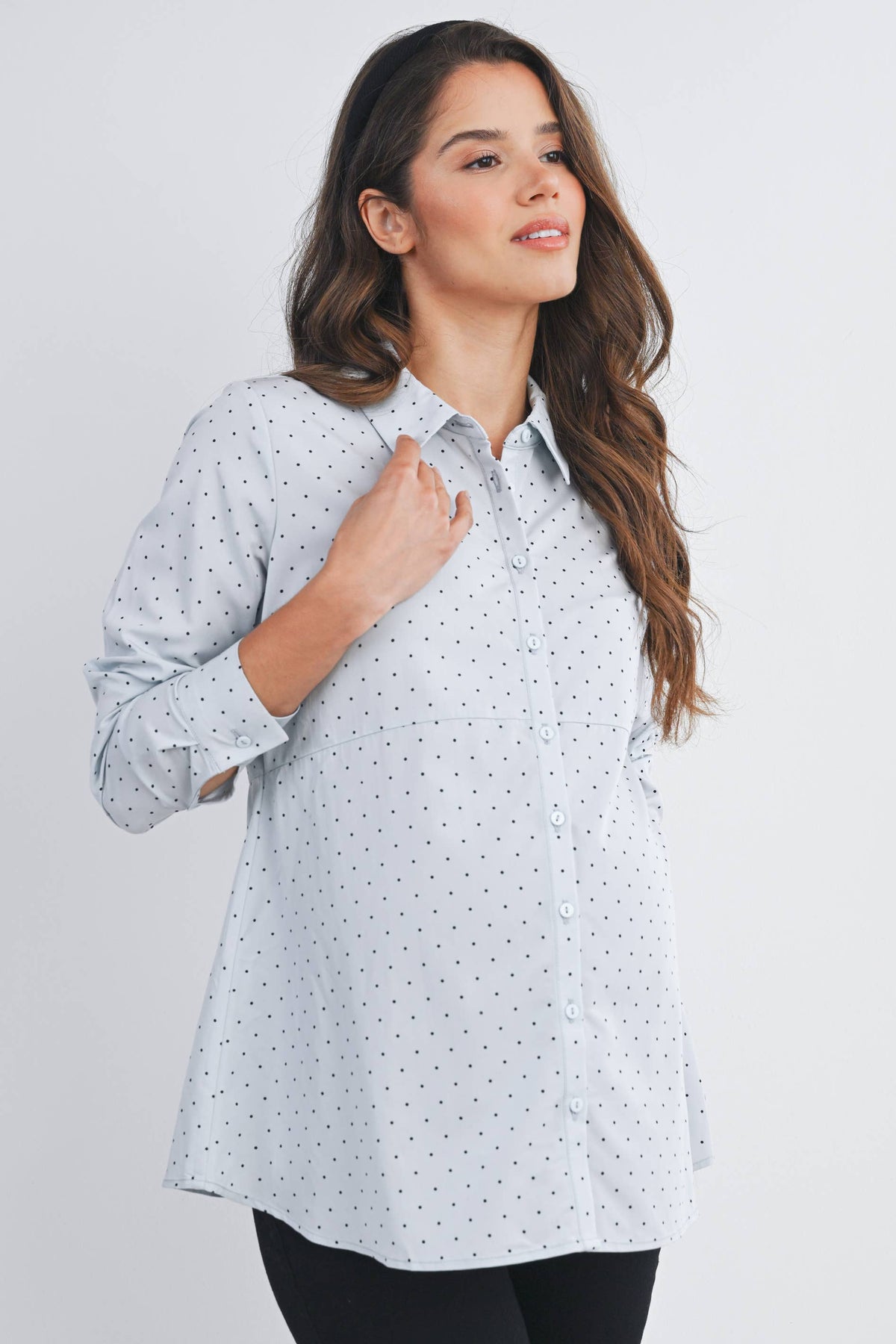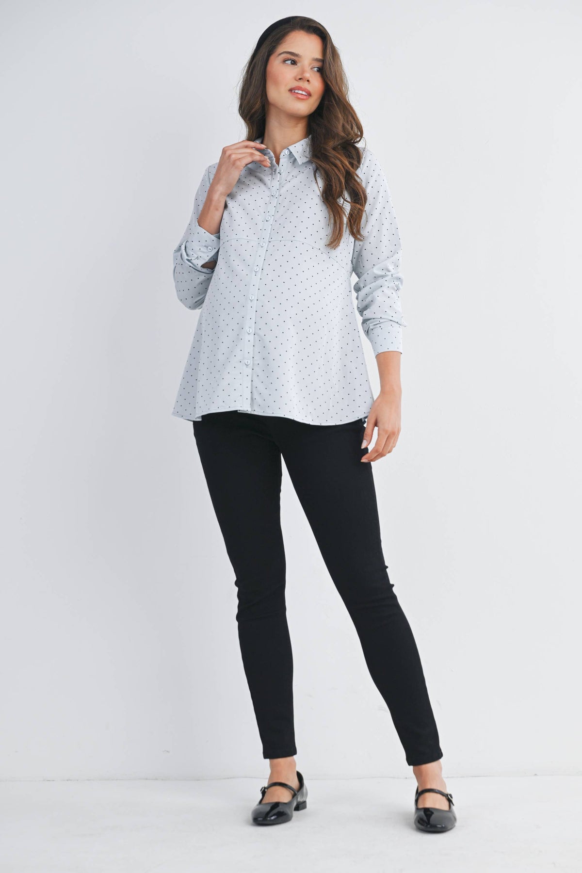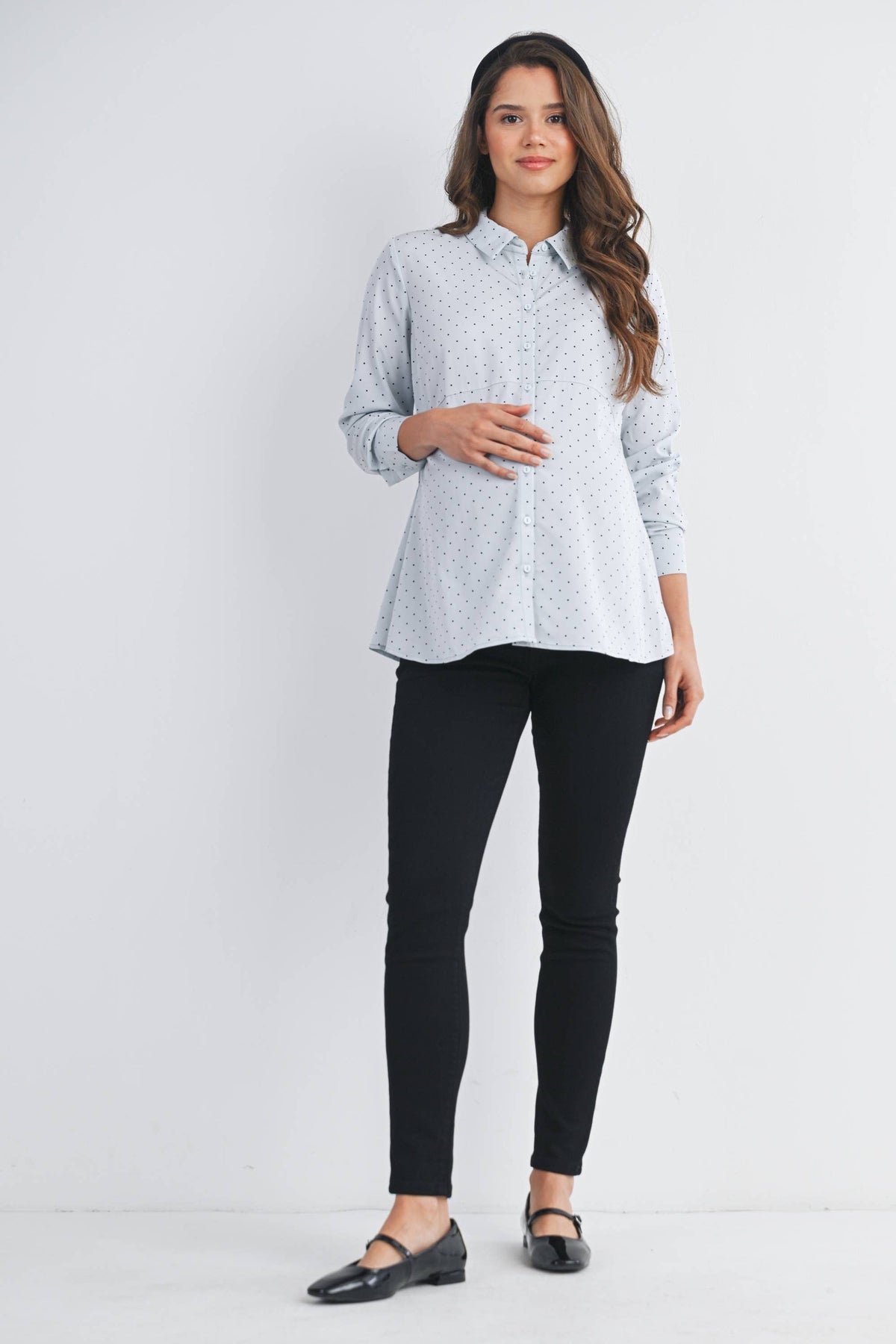 Meet Dottie, your new go-to maternity essential! This charming polka dot button-down features a relaxed fit that grows with you through every trimester. The long sleeves offer versatile coverage for any season, while the classic dot pattern adds a touch of whimsy to your everyday wardrobe. Easy to style with jeans or dress up for work, this top combines comfort with effortless style—because pregnancy fashion should be fun!